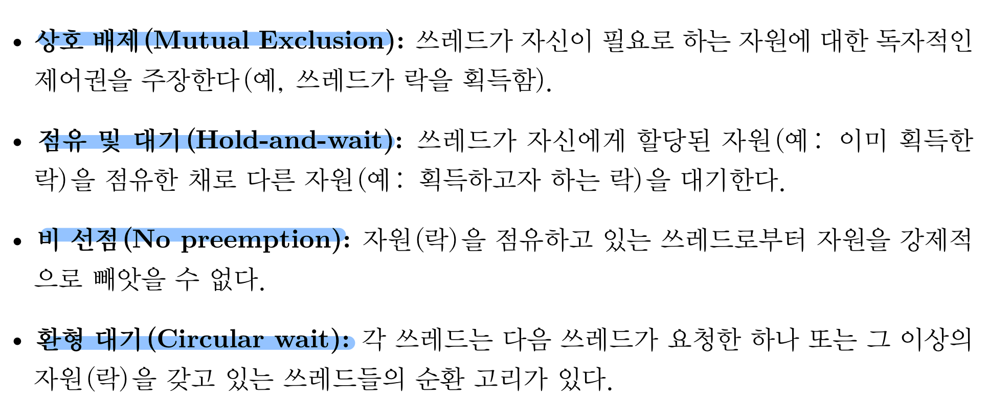 교착상태(DeadLock)이 발생하는 조건은 아래의 4가지 조건이 모두 충족되어야 한다는 것이다. 좋은 점은 4가지 중 한가지 요소만 제거시켜도 교착상태(DeadLock)이 발생하지 않는다는 것이다.