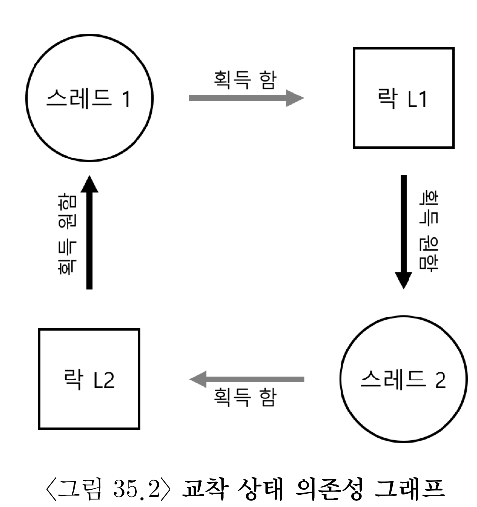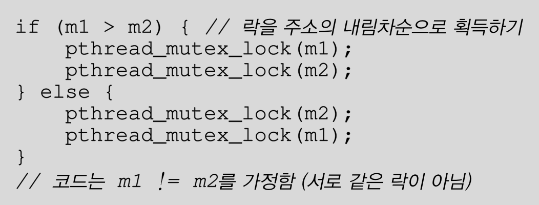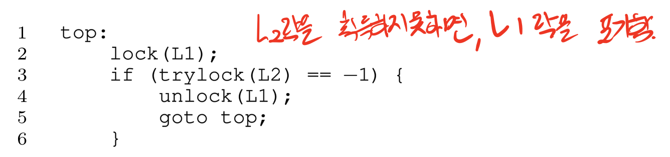 위 예에서는 prevention이라는 락을 만들어 사용하여 두개의(L1,L2)락을 얻는 과정을 원자적으로 만들었다. 그러나 이 해법에는 문제점이 많다. 캡슐화 되어 필요한 락들을 정확하게 파악하기 힘들고, 락이 실제 필요할때 요청하는 것이 아니라 미리 모든 락들을 한번에 획득하기 때문에 병행성이 저하되는 문제가 생긴다.
