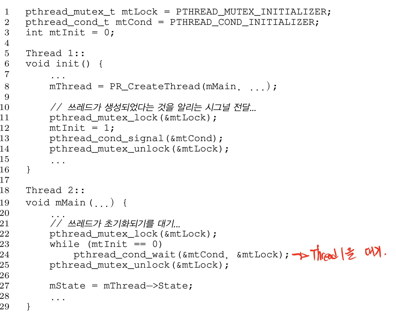 mtInit이라는 조건을 확인하고 이 조건이 1이 되면 T1이 실행됐다는 증거이다. 물론 세마포어를 활용할 수도 있을 것이다. 여튼 T2가 먼저 실행됐다면 기다리기 위해서 wait가 되고 mtCond이라는 컨디션 변수(큐)에서 대기하고 있게 된다. 그리고 T1이 실행되고 signal을 보내 wait에 깨운 후, mtInit을 다시 검사하고 그 뒷부분이 마저 실행되게 된다.
