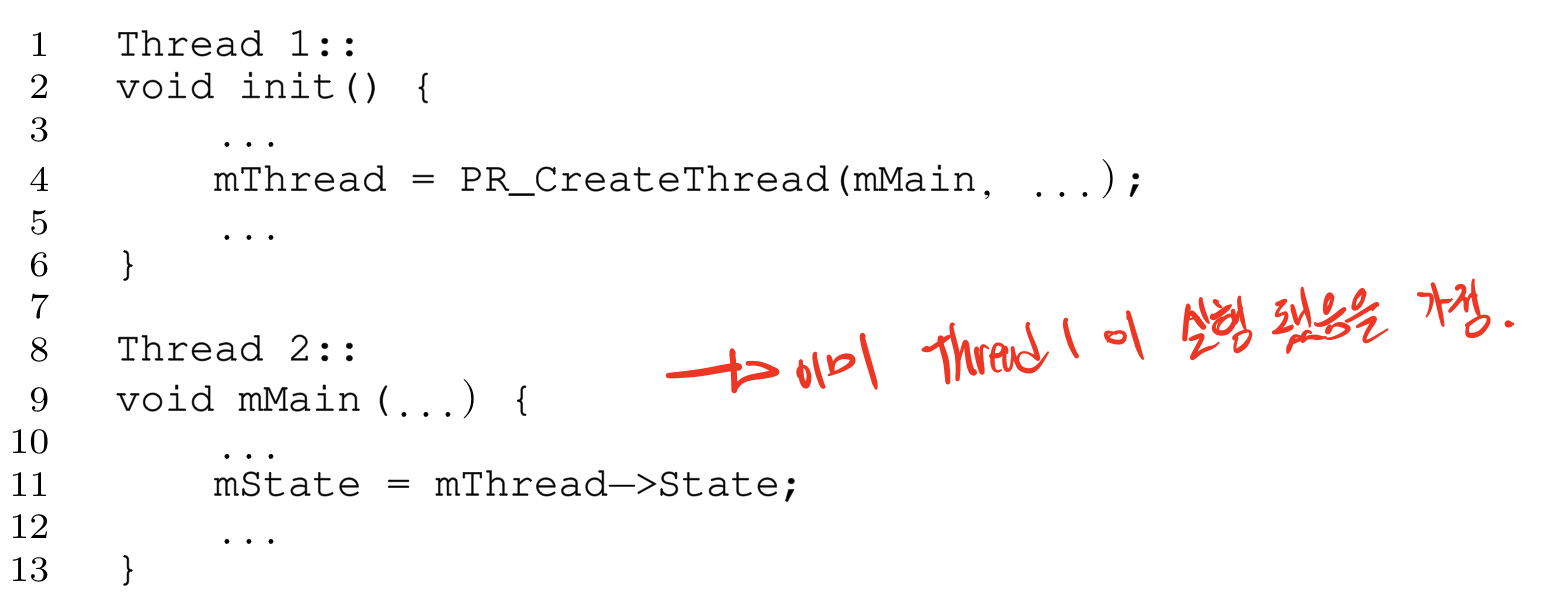 위 예제에서도 T1과 T2과 존재한다. T2는 이미 쓰레드가 존재한다는 가정하에 실행된다. 그말은 즉 T1쓰레드가 이미 실행을 마친 후 T2의 11번 라인이 실행되어야 한다는 의미이다. 만약 T1이 먼저 실행되지 않았다면 T2는 NULL포인터를 사용하기 때문에 에러가 발생되어 프로그램이 종료될 것이다. 즉 T2가 항상 T1보다 먼저 실행되어 햔다는 순서가 지켜지지 않았다.