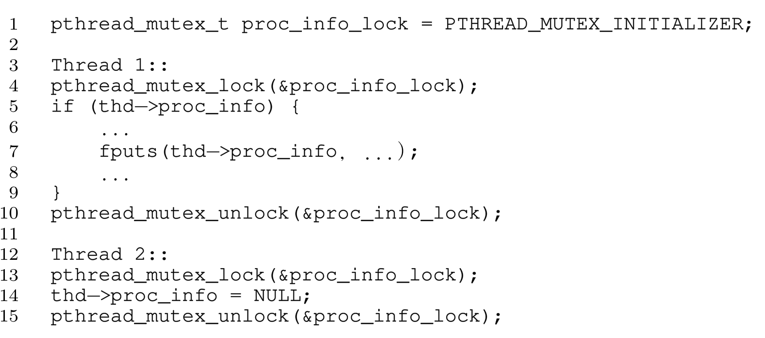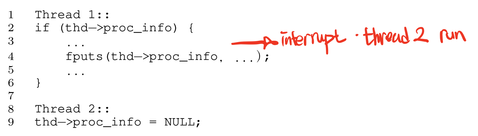 두개의 T1, T2쓰레드가 각각 존재한다. T1쓰레드는 생성한 쓰레드의 proc_info가 NULL인지 검사하고, 새로운 값을 넣는다. T2는 prco_info를 null로 만든다. 즉 T1의 4번라인 fputs()은 null인지 체크 후 null이 아닐때만 실행 되도록 해야한다. 지금까지 공부해왔던 것을 바탕으로 lock을 통해서 임계영역을 분리해 atomic하게 코드가 돌아가야 한다는 필요성을 느낄것이다. 빨간색으로 써놓은 것과 같이 2번이 실행 후 NULL이 아님을 체크했지만 인터럽트가 걸리면서 T2가 proc_info를 NULL로 바꾸게 된다면 원치 않는 상황이 펼쳐 질 것이다.
