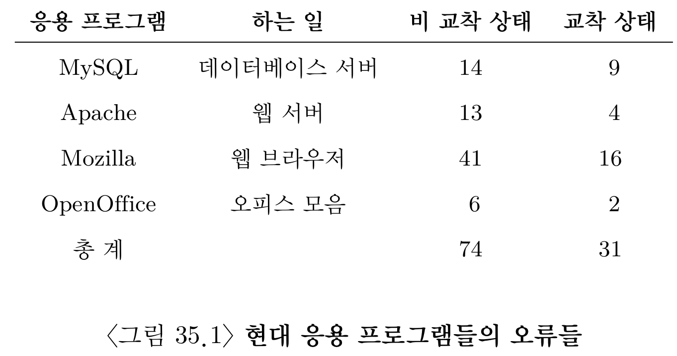 병행성 오류들에는 어떤 것들이 있을까? 교과서에는 실제 사용되는 오픈소스 프로그램을 활용하여 오류들과 오류들의 빈도를 알아보았다. MySQL, Apache, Mozilla, OpenOffice가 그 대상군 이었다. 아래의 오류 통계를 살펴보면 총 105개의 오류가 있었고, 74개의 오류는 교착상태와 무관한 오류 있다.