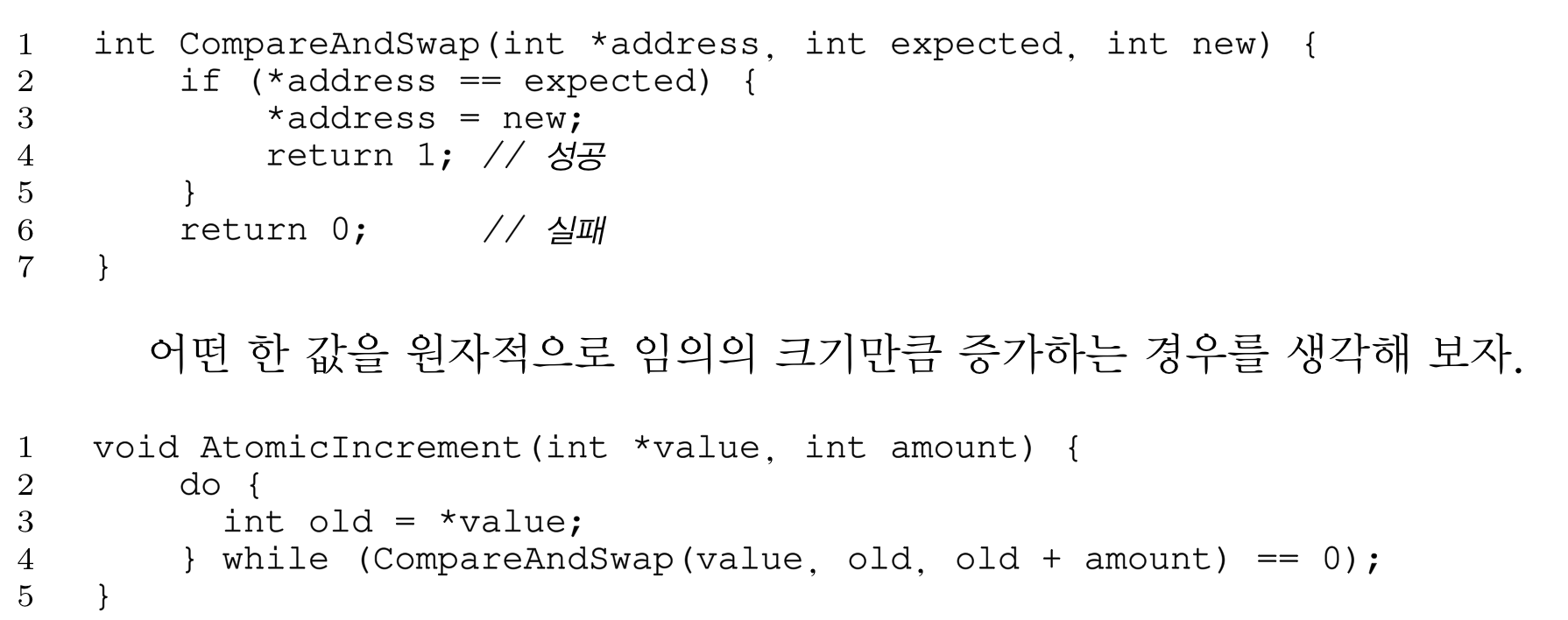 락을 획득하고 값을 갱신한 후에 락을 해제하는 대신에, Compare-And-Swap이라는 원자적인 명령어를 통해서 갱신하도록 만든다.