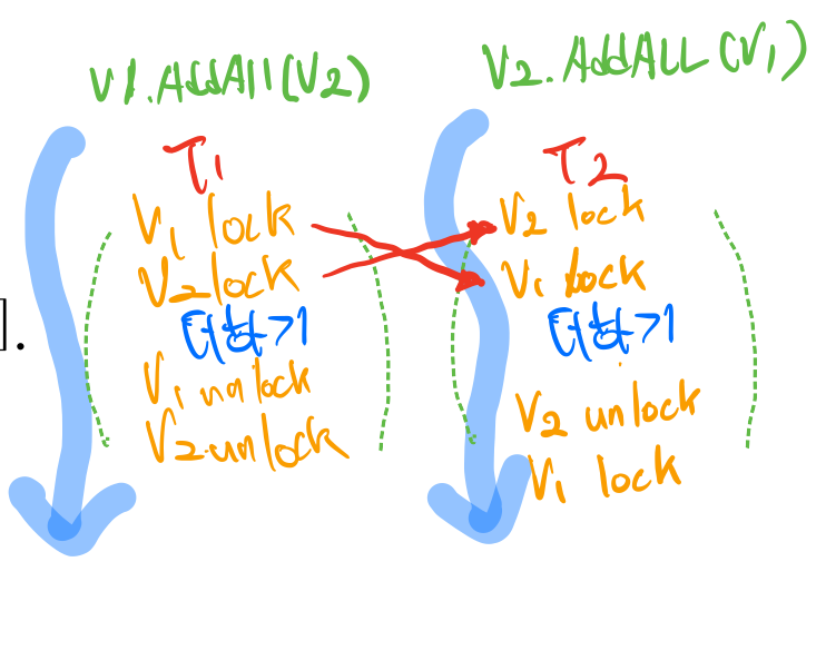 위의 예와 같이 v1과 v2를 더하는 간단한 AddAll이라는 함수는 캡슐화 되어 있다. v1과 v2를 더하기 위해서는 각 벡터를 락으로 보호해야 한다. 그렇지 않으면 더하는 도중에 다른 코드가 해당 값을 건들여 버릴 수 도 있을 것이다. 그래서 AddAll은 v1에 대한 락을 획득하고 v2에 대한 락을 획득하게 코드가 짜여졌을 것이다. 이렇게 되면 문제 없어 보이지만 다른 쓰레드에서 v2.AddAll(v1)을 실행 했을때는 교착 상태의 발생 가능성이 있음을 짐작 할 수 있다.