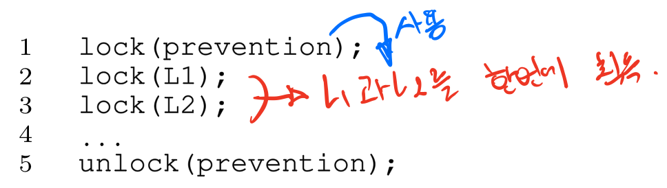 위 예에서는 prevention이라는 락을 만들어 사용하여 두개의(L1,L2)락을 얻는 과정을 원자적으로 만들었다. 그러나 이 해법에는 문제점이 많다. 캡슐화 되어 필요한 락들을 정확하게 파악하기 힘들고, 락이 실제 필요할때 요청하는 것이 아니라 미리 모든 락들을 한번에 획득하기 때문에 병행성이 저하되는 문제가 생긴다.