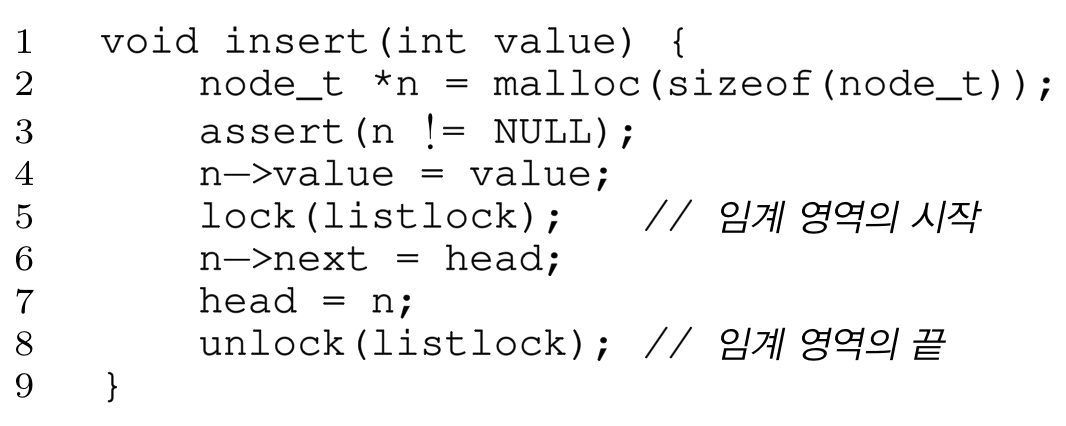 간단히 락을 통해 임계영역으로 분리시켜버리자, 그렇다면 중간에 인터럽트가 걸리더라도 lock이 없기 때문에 쓰레드가 락을 반납할때까지(임계영역의 실행 완료)기다리게 될 것이다.