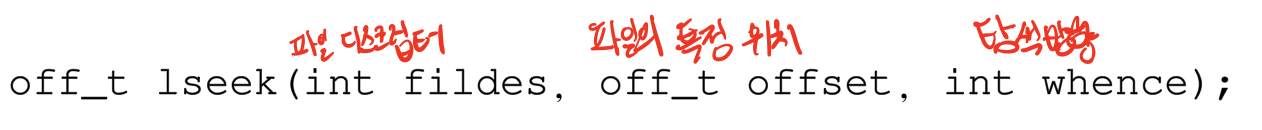 lseek()는 디스크 암을 이동시키는 디스크의 탐색(seek) 작업과 아무 관계가 없다는 것에 유의해야한다. lseek()호출은 커널 내부에 있는 변수의 값을 변경하는 것이다.