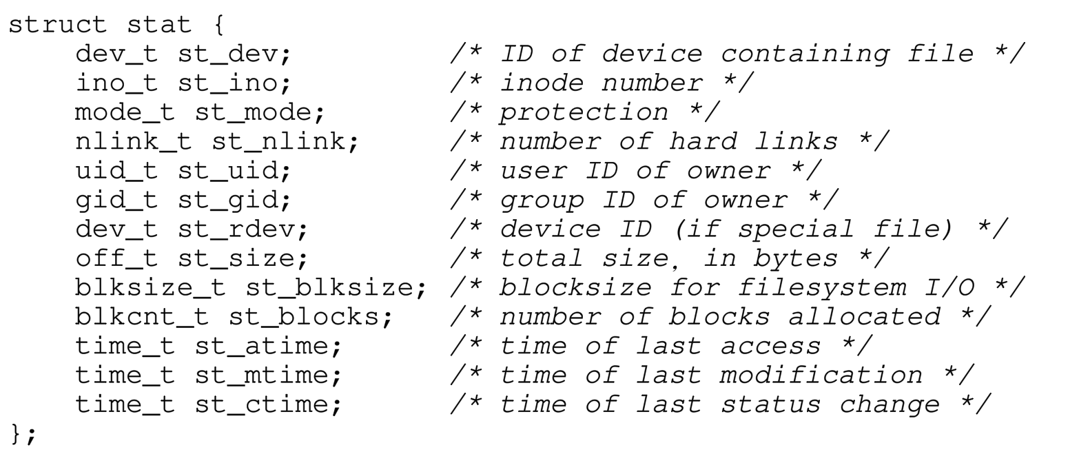 파일 시스템은 각 파일에 대한 정보를 보관한다 했다. 파일에 대한 정보를 메타데이터라고 했는데 inode에 이 정보가 보관된다고 했었다. 어떤 파일의 stat()이나 fstat()를 호출하면 파일의 메타데이터를 볼 수 있다.