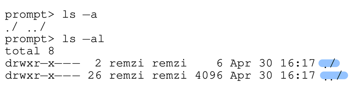 디렉토리를 처음 생성하면 비어 있다고 생각들지만, 위에서 언급했듯 .(자신) 과 ..(부모)의 위치를 가르키는 것이 자동적으로 생성된다. 아래 ls명령어를 통해서 생성된 폴더를 확인해 보면 알 수 있다.