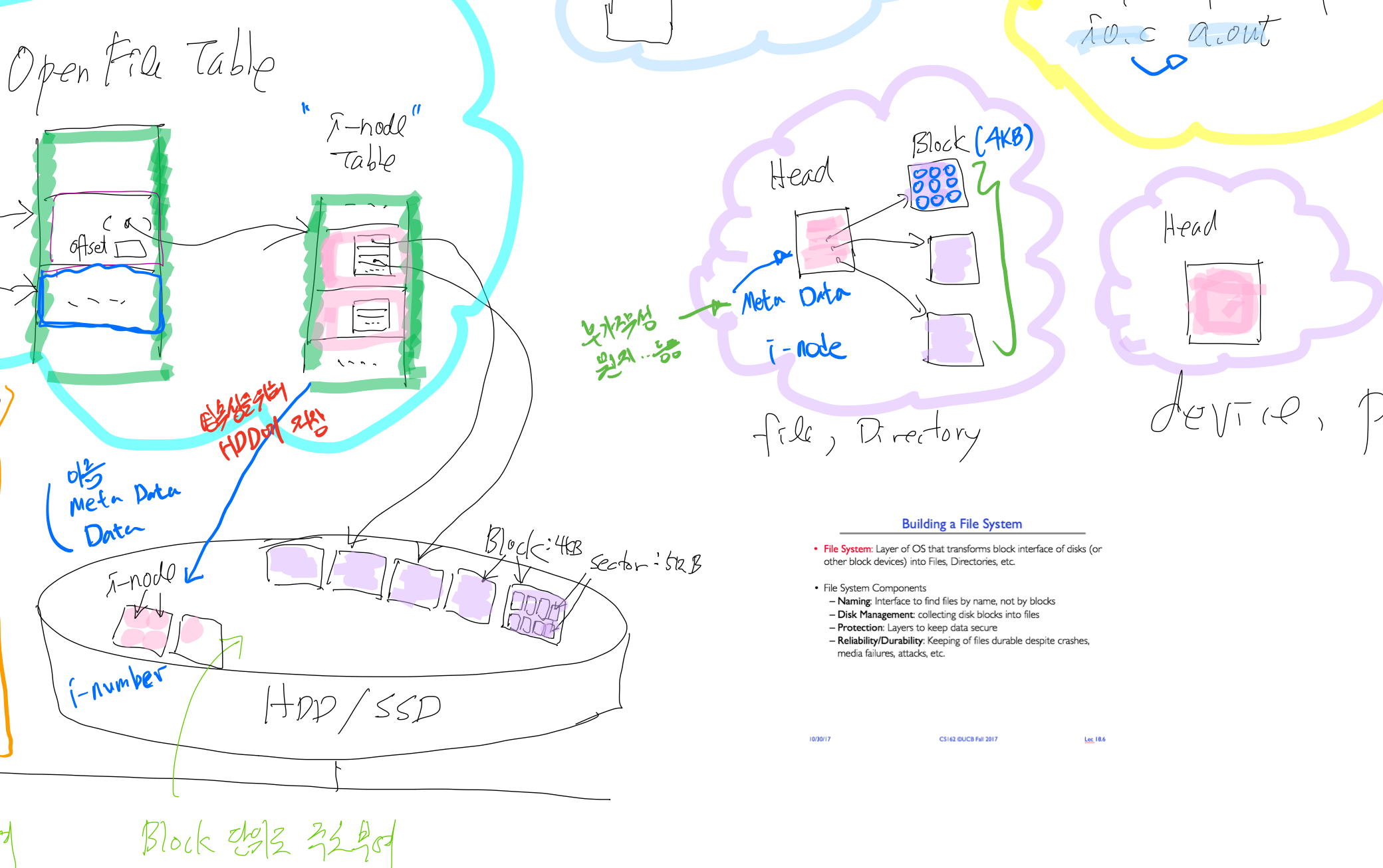 저장 장치의 가상화에대해서 파일과 디렉토리라는 주요 개념이 개발 됐다. 파일은 단순히 읽거나 쓸 수 있는 순차적인 바이트들의 배열이다. 각 파일은 저수준의 inode-number라는 이름을 가지고 있다. 이 inode-numberE는 숫자로 표현되지만 사용자는 그 이름에 대해서 잘 알지 못한다. inode-number는 어떠한 inode에 대한 ID값이라고 생각 할 수있다. 이 inode에는 메타데이터라는 것이 담겨 있으며, 블락단위로 HDD or SDD에 저장되는 파일들을 포인터로 가르키고 있다고 생각하면 된다. 이 섞여 있는 것들을 한 파일을 위한 inode를 읽으면 종합해서 어떠한 파일인지를 알고, 각각의 블럭들을 불러올 수 있다. 현재로써는 각 파일은 inode-number와 연결 돼 있다고 생각하자.