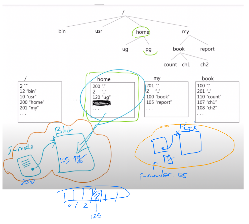 위와 같이 디렉토리별 inode가 존재하고 그 inode안에 하나의 블락이 잡힌다. 폴더구조를 관리하기 위해서는 그렇게 큰 크기가 필요하지 않는다고 한다. 그리고 그 블럭안에 <사용자가 정한 이름, 저수준의 inode-number>와 같이 저장되면서 폴더 디렉토리를 결정한다. 이런 것을 디렉토리 트리(directory tree)또는 디렉토리 계층(directory hierarchy)라고 한다. 하나의 폴더에는 기본적으로 자신의 디렉토리( ./ ) 와 부모 디렉토리( ../)을 가리키는 것이 기본적으로 포함된다.