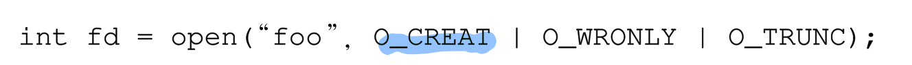 다음과 같이 open()을 호출하면서 O_CREAT라는 플래그를 전달하면 새로운 파일을 만들 수 있다. 위의 경우에는 foo라는 파일을 현재 디렉토리에 생성한다. O_WRONLY플래그는 파일이 열렸을 때 쓰기만 가능하도록 플래그를 설정한다. O_TRUNC플래그는 파일이 이미 존재할 때는 파일의 크기를 0byte로 줄여서 기존 내용을 모두 삭제한다.