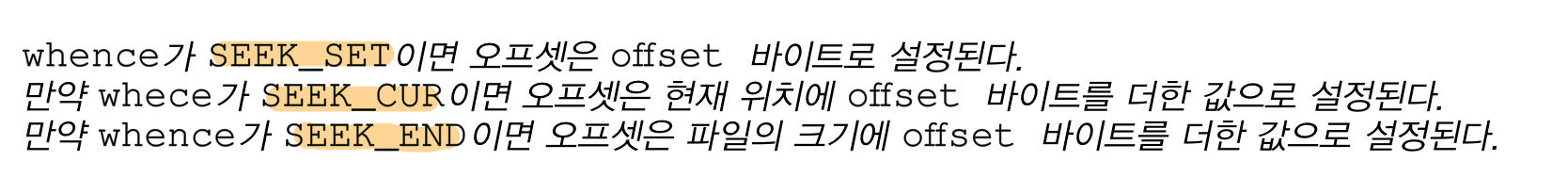 첫번째 인자는 파일 디스크럽터이며, 두번째 인자는 offset으로 파일의 특정위치(file offset)을 가리킨다. 세번째 인자는 whence라고 부르며 탐색 방식을 결정한다.