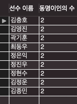 SELECT PLAYER_NAME AS '선수 이름', COUNT(*) AS ' 동명이인의 수'