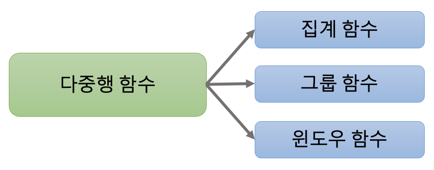 이번 포스트에서는 다중행 함수에 대하여 정리해 볼 거다. 다중행 함수를 알아보기 전에, 다중행 함수의 종류와 앞서 설명했었던 #4 에서 SELECT을 정리하면서, 쿼리문들의 실행순서에 대해서 설명했었는데, 그점을 다시 짚어보고 정리를 시작하겠다. 단일행 함수와 다중행 함수의 차이점은 생각해보면 쉽다. 단일행 함수는 한 행 한행 실행하면서 그 결과를 보여주는 반면, 다중행 함수는 여러 행들을 다 보고나서 함수를 적용하고 계산한다. 예를 들어, 평균(AVG)을 구하고 싶다. 평균을 구하려면 일단 모든 행들을 다 훓어보면서, 구하고자하는 value들과 총 몇개의 대상이 존재하는지 살펴 봐야한다. 하나의 데이터만 보고 평균을 구할 수 없다는 것이다. 이게 다중행 함수와 단일행 함수의 차이다. 하나만 볼것인가, 전체를 볼것인가