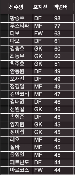 등번호가 NULL이 아닌 선수들에 대하여 백넘버를 내림차순으로 정의하고, 만약 같을 시에는 포지션을 오름차순순으로 비교, 그마저 같으면 선수명으로 비교하는 로직이다.