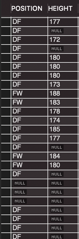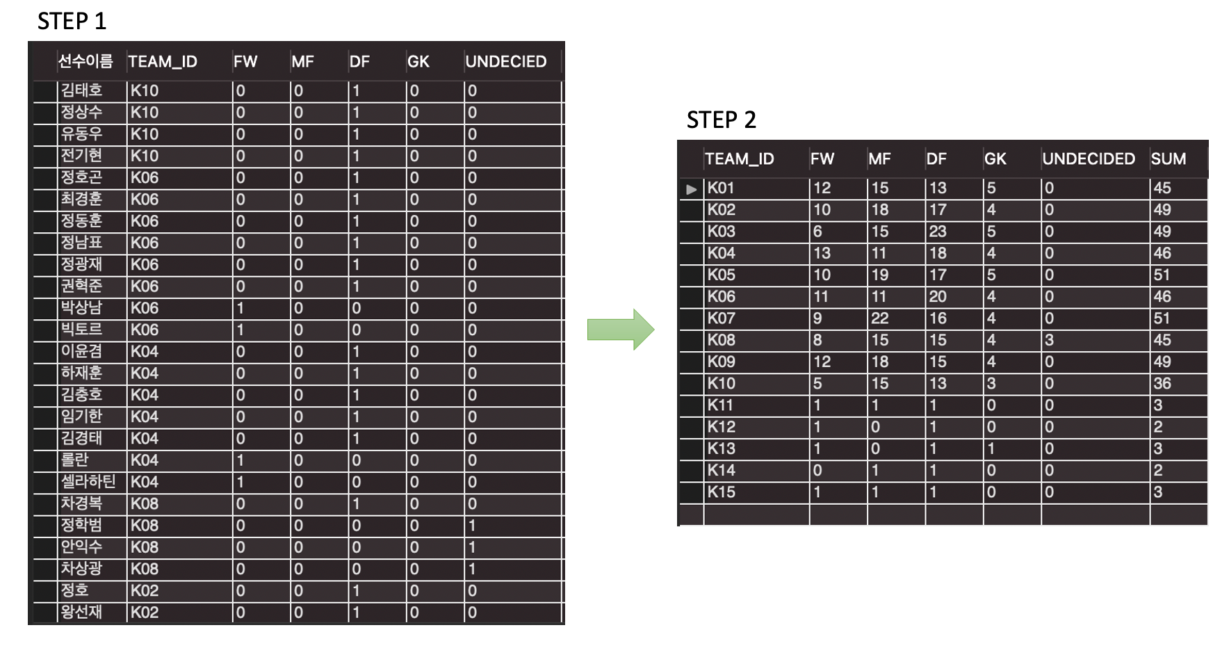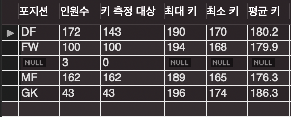 흐름대로 정리하자면 먼저 PLAYER 테이블에 접근하여 POSITION이 같은 데이터들에 대하여 하나의 그룹으로 연결 시킨다. 그 과정속에서 DF,FW,NULL,MF,GK로 그룹화 될것이고, 이 그룹들에 대하여 SELECT에 집계연산자들이 적용된다.
