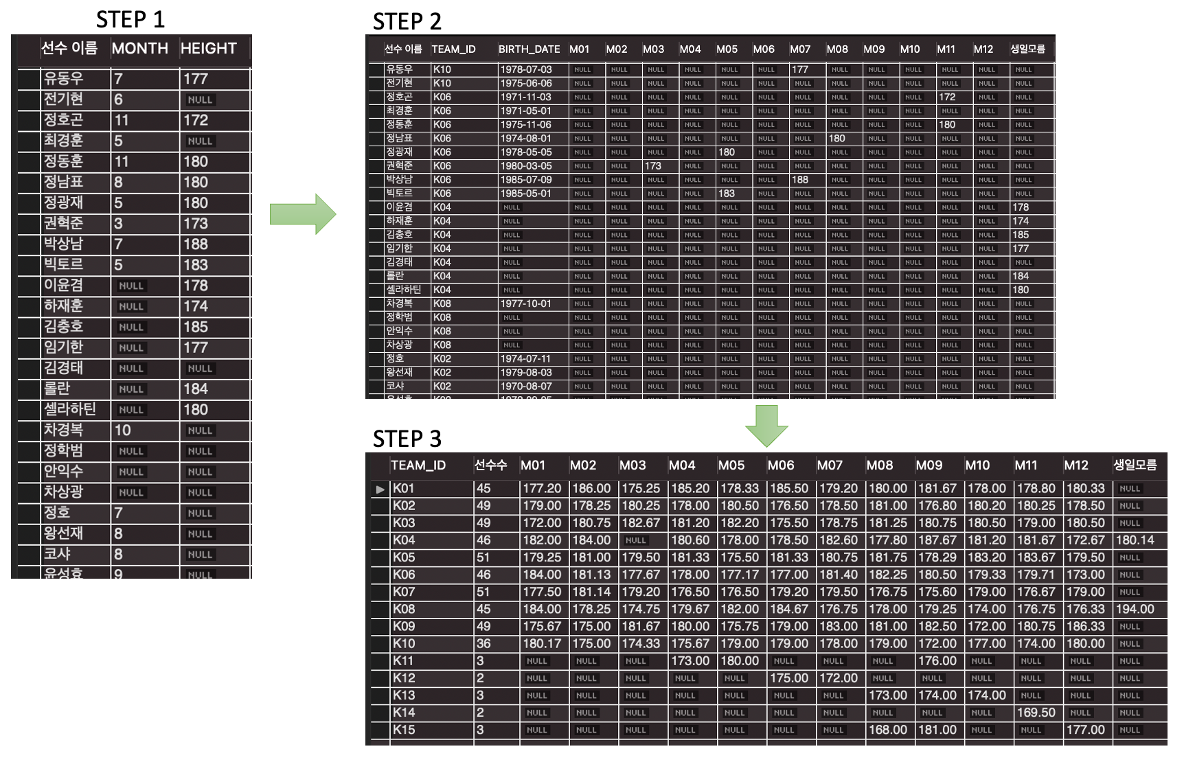 SELECT PLAYER_NAME AS '선수 이름', MONTH(BIRTH_DATE) MONTH, HEIGHT