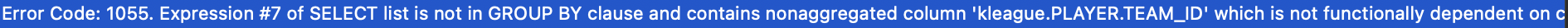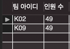 이때 GROUP BY절을 실행 하면 해당 그룹으로만 이루어진 임시 테이블이 생선된다. 이 임시 테이블은 집단 함수에서 사용하는 컬럼만으로 구성된다. TEAM_ID를 SELECT 하려 하지만 그룹핑 된 임시테이블에는 TEAM_ID 가 없기 때문에 오류가 난다. 참고한 강의 문서에서 MySQL에서는 에러를 표현하지 않고 가장 첫번째 값이 나온다고 했으나, 실습 해본 결과 에러가 출력됐다.