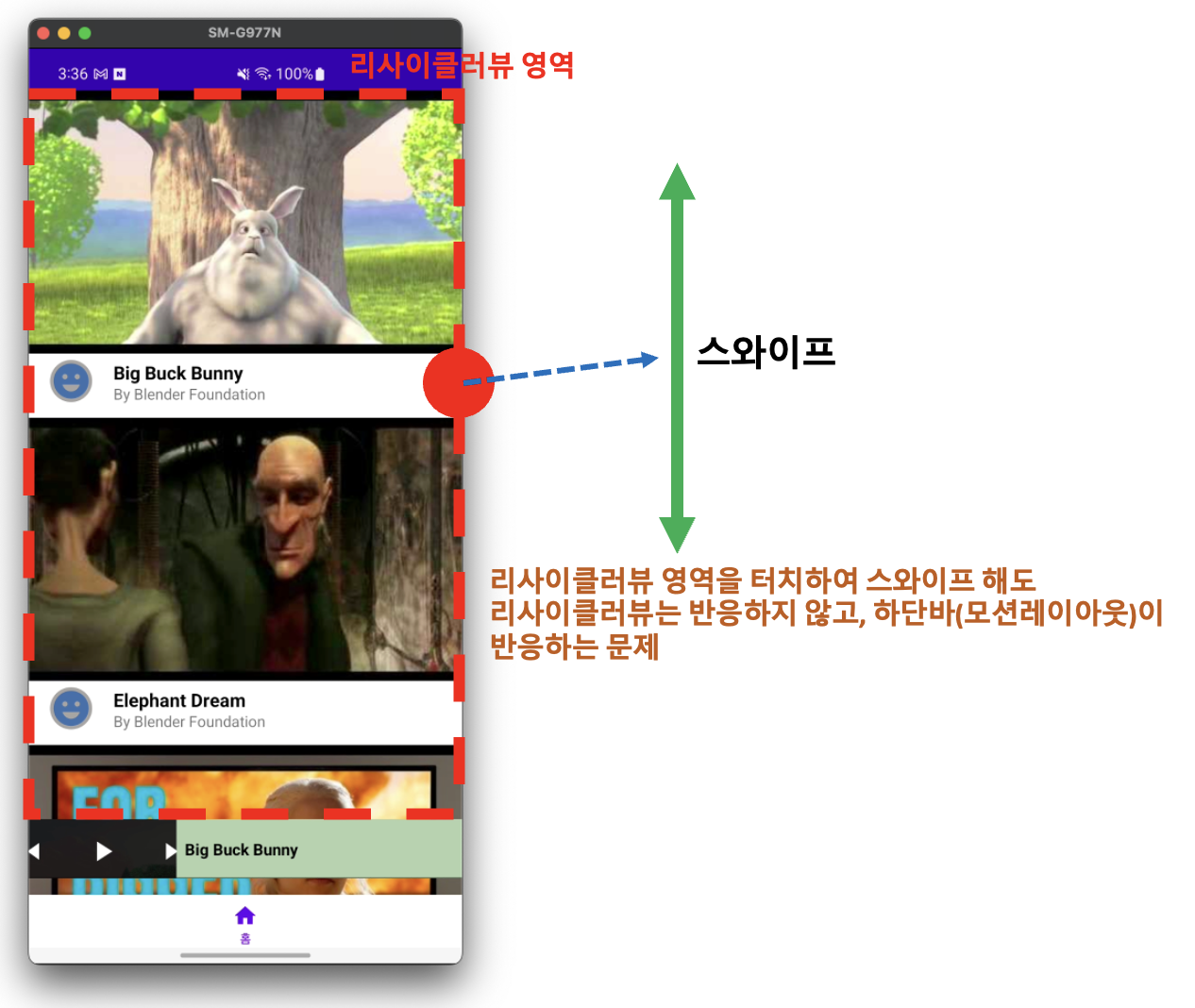 한가지 문제점이 발생했는데, 동영상 리사이클러뷰를 밑으로 내려도 프레임 레이아웃부분에 터치가 반응하여 모션레이아웃이 반응해버리는 문제점이 생겼다. 구글을 조금 찾아 봤는데 뷰그룹간에 터치할 시에 계층 순서별로 onTouchEvnet가 true/false를 반환하는데 true로 반환해버리면 터치 이벤트를 처리했다는 뜻이기 때문에 그 밑에 뷰로는 터치가 왔다는 사실은 모른체 터치 반응이 끝나버리기 때문에 생기는 이슈였다.