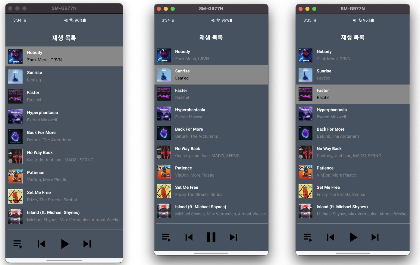 다음 또는 이전 버튼이 눌리면, 다음노래가 뭔지를 찾아낸후 재생시키는 것이다. 다음 노래가 뭔지를 찾고, 그 노래의 인덱스를 exoPlayer에 알려준 후 재생시킨후, model(PlayerModel)에서도 currentMusicPosition을 업데이트 해준다. 그리고 나서 exoPlayer에 리스너를 추가해 음악이 바뀌었다는 것에 콜백함수를 등록하여 리사이클러뷰에 현재 재생중인 음악의 뒷 배경이 바뀌도록 해주면 된다.