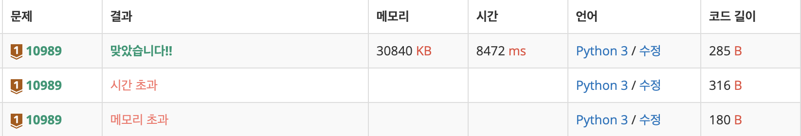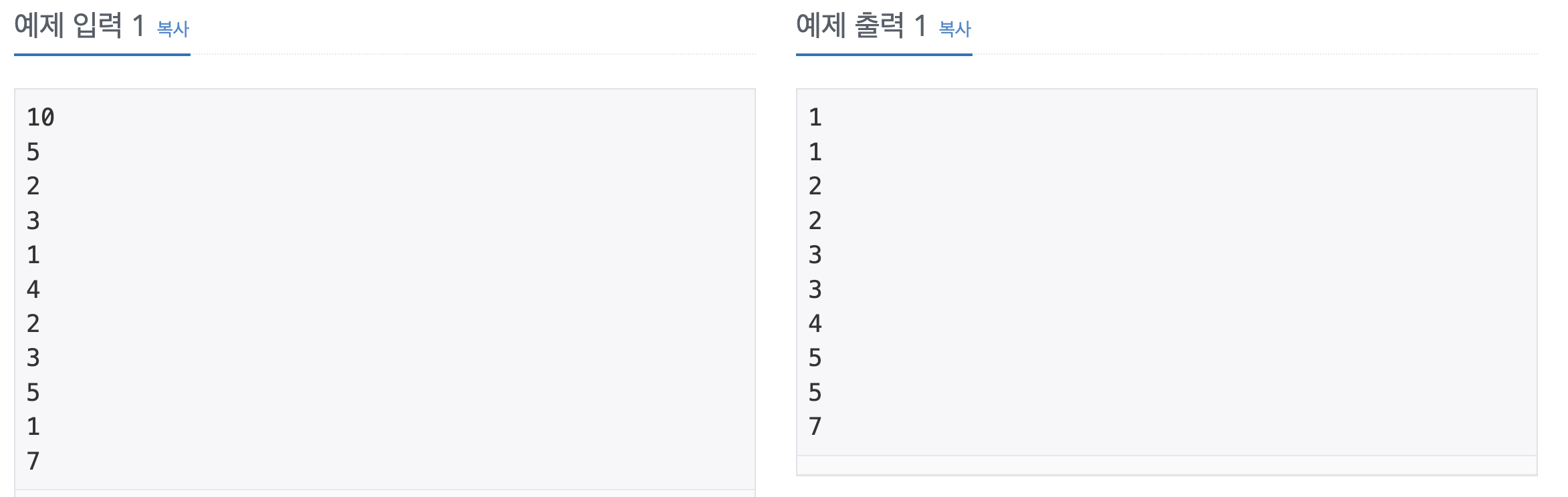 간단하다. 딕셔너리를 사용해서 만약에 딕셔너리에 값이 들어온 적이 없다면 해당 딕셔너리 관계를 만들어주고 초기화(1)로 설정해준다. 다음에 딕셔너리에 있는 값이 들어오면 +1을 해준다. 그리고 들어온 값들에 최초 한번 리스트에 저장해서 해당 리스트를 정렬해주고, 딕셔너리에 맵핑되어있는 count된 값들만큼 출력해서 정렬을 수행했다. 아쉽게도 시간초과가 떴다. 데이터를 순회하고, sort하면서 너무 많은 자원을 낭비 한게 아닐까 싶다.