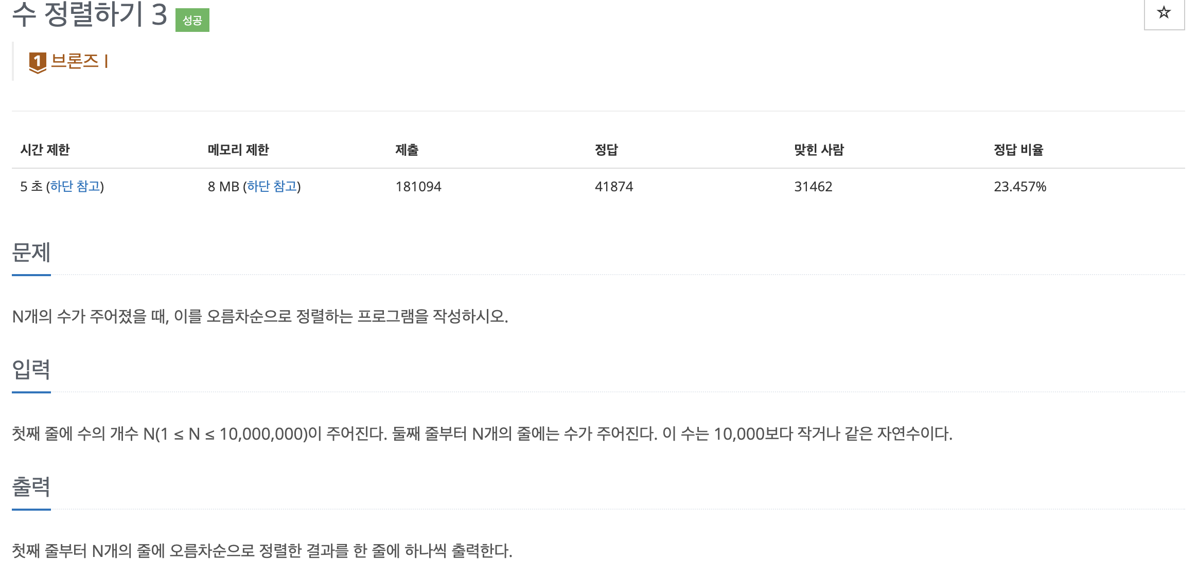 위 풀이와 접근법은 유사하지만, 딕셔너리의 키를 탐색하는 시간과, 들어왔던 값들을 sort하는데 드는 시간을 아낄 수 있다. 최초로 가능한 수만큼을 미리 배열에 만들어 놓고, 해당 인덱스가 그 수의 key이고 인덱스에 저장되는 값이 호출된 개수이다. 해당 개수를 하나씩 늘려가는 방법을 사용하면 된다. 위 방법을 계수정렬이라고 한다 했다.