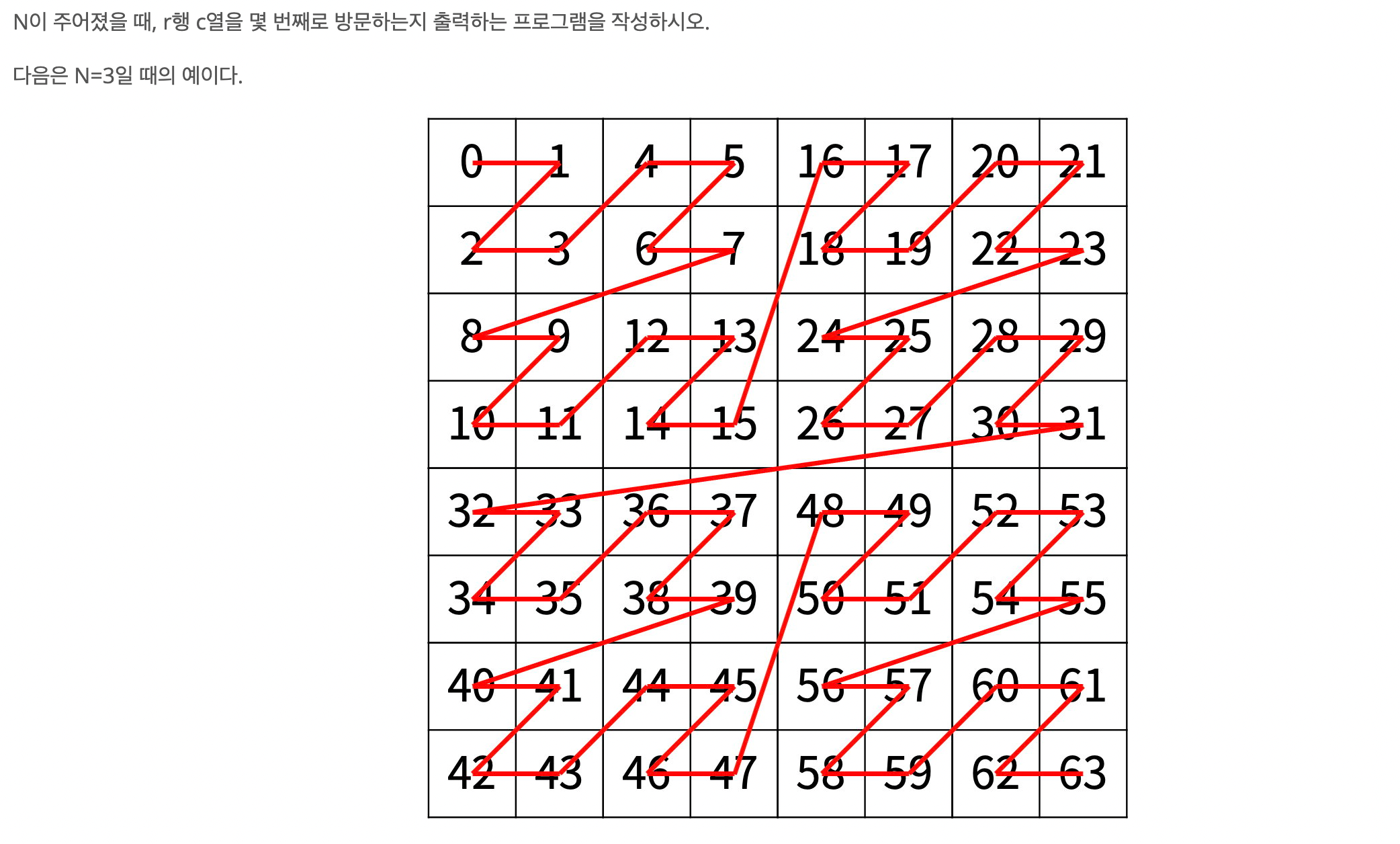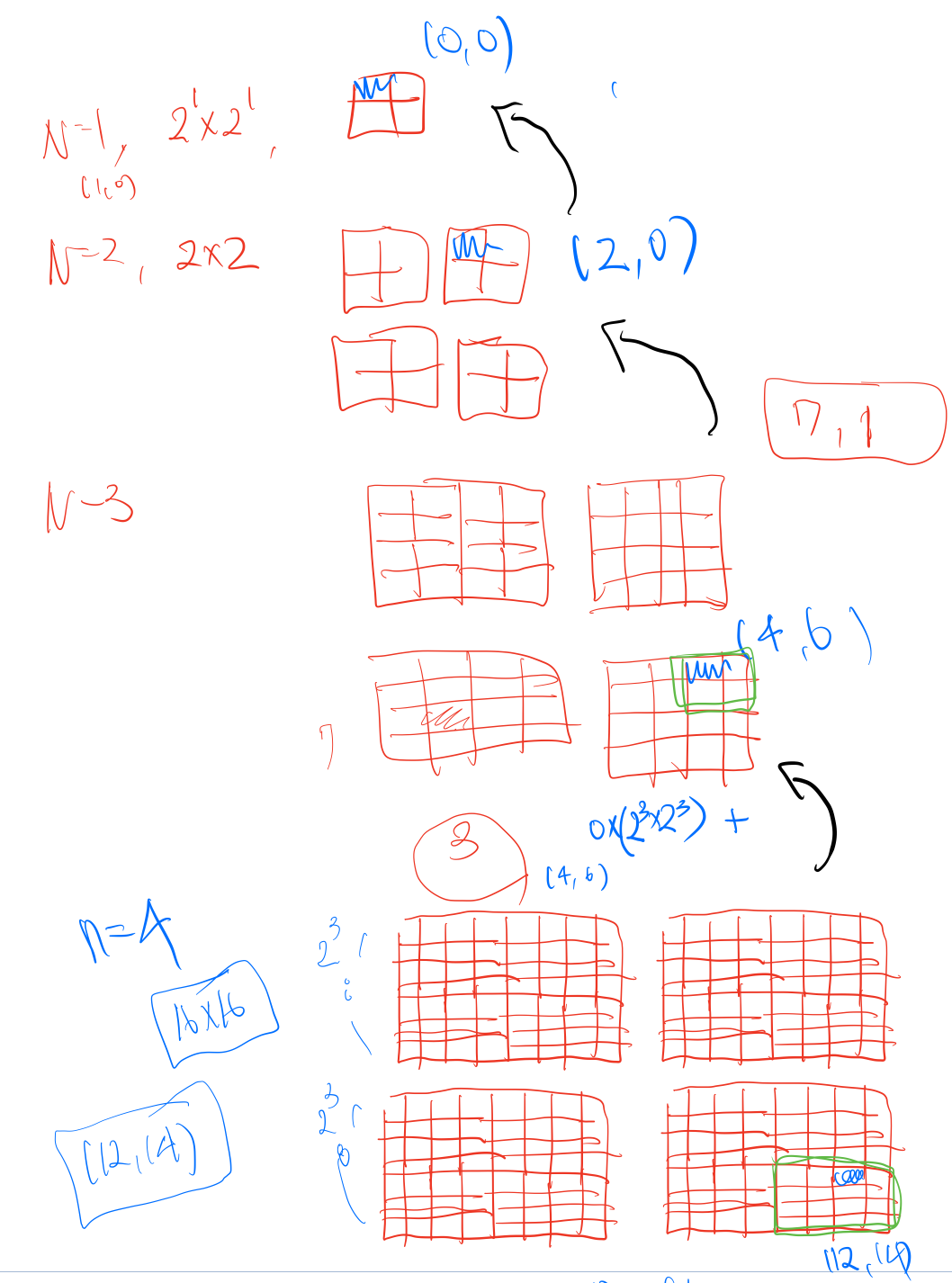 현재 구해야 하는 곳이 N=4, row=12, col=14라면 0~3사분면까지의 길이 + 함수(row=4,col=6)으로 다운스케일링이 가능 할 것이다. 그렇게 N=1 일때까지 함수를 호출해준다.