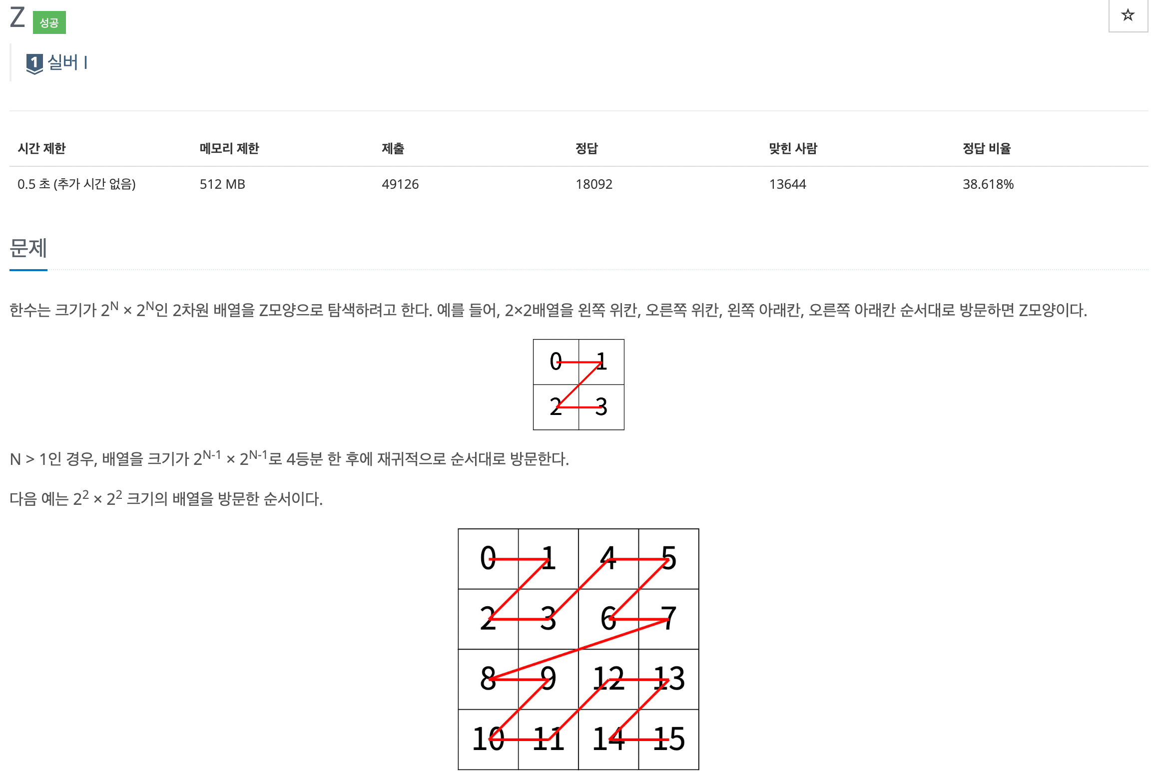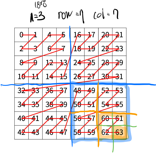 만약 내가 찾아야하는 곳이 (7,7)의 위치면 위의 그림과 같이 된다. 주어진 정사각형은 4등분으로 구역을 나누며 Z모양을 그린다.