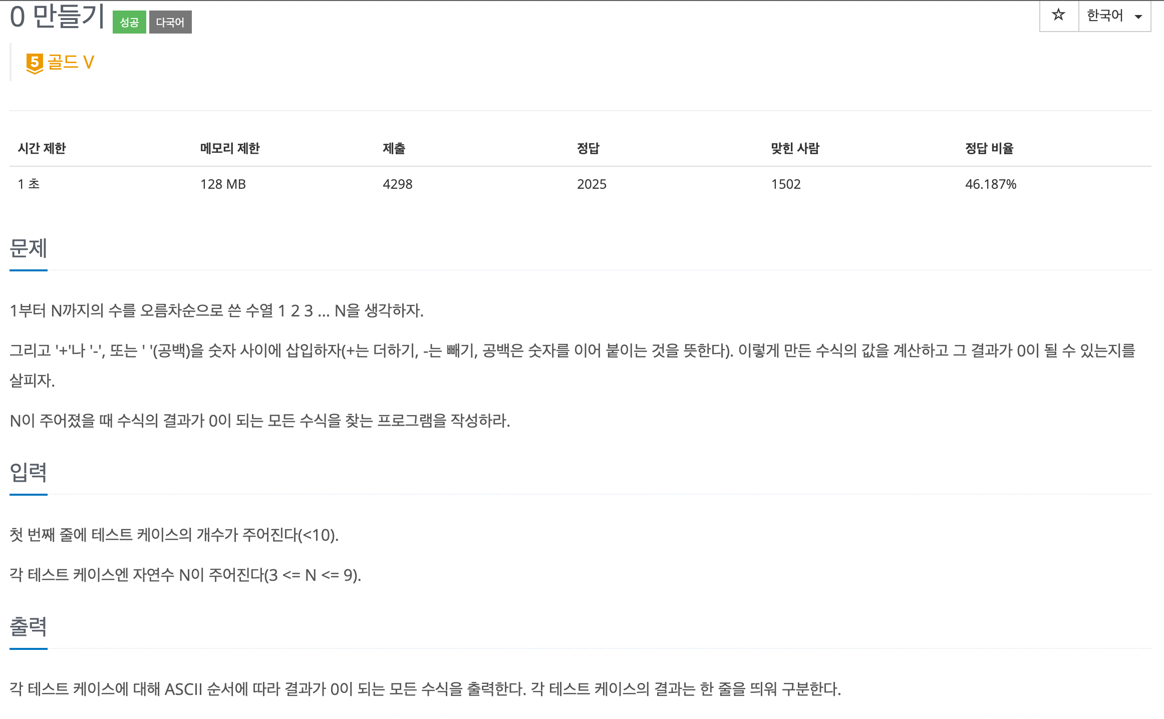 문자열을 계속해서 더해나가면서 주어진 수까지의 입력이 끝나면 eval을 이용해서 0인지 확인하고 맞다면 바로 출력해버리면 된다.