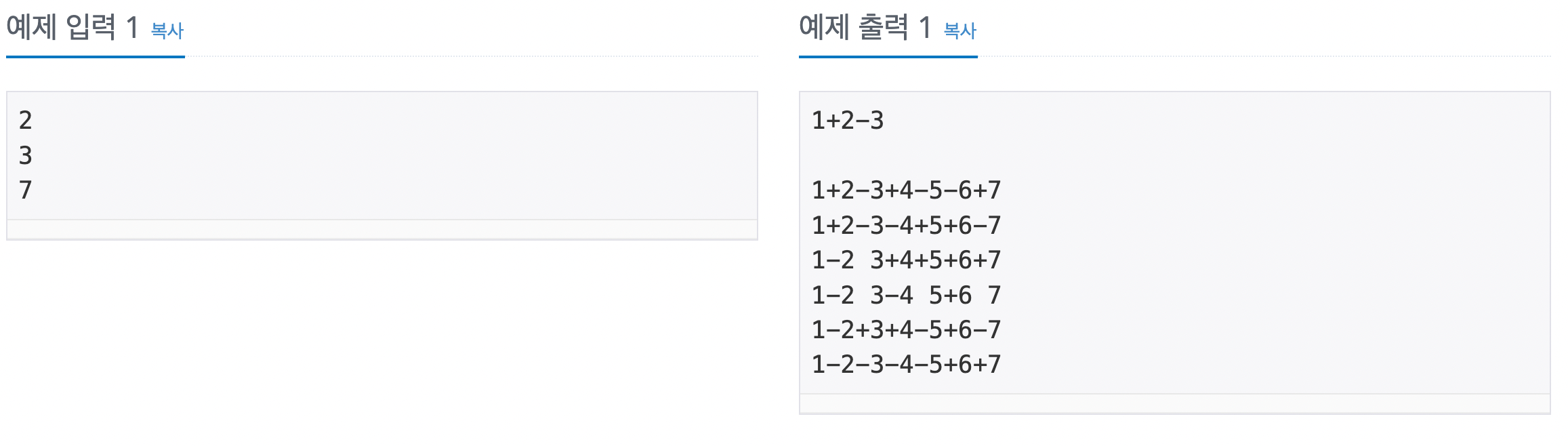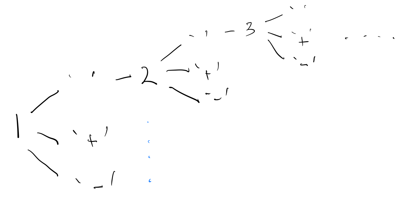 다음과 같이 1 다음에 공백,'+','-'가 오고 2 다음에도 똑같이 반복할 수 있다. 재귀적으로 하나씩 스택이 쌓이면서 해결해 나가는 방법을 사용하면 될 듯했다. 어떻게 보면 재귀를 이용해 완전 탐색하는 방법이고, 최종 결과가 0이면 출력해주면 된다.