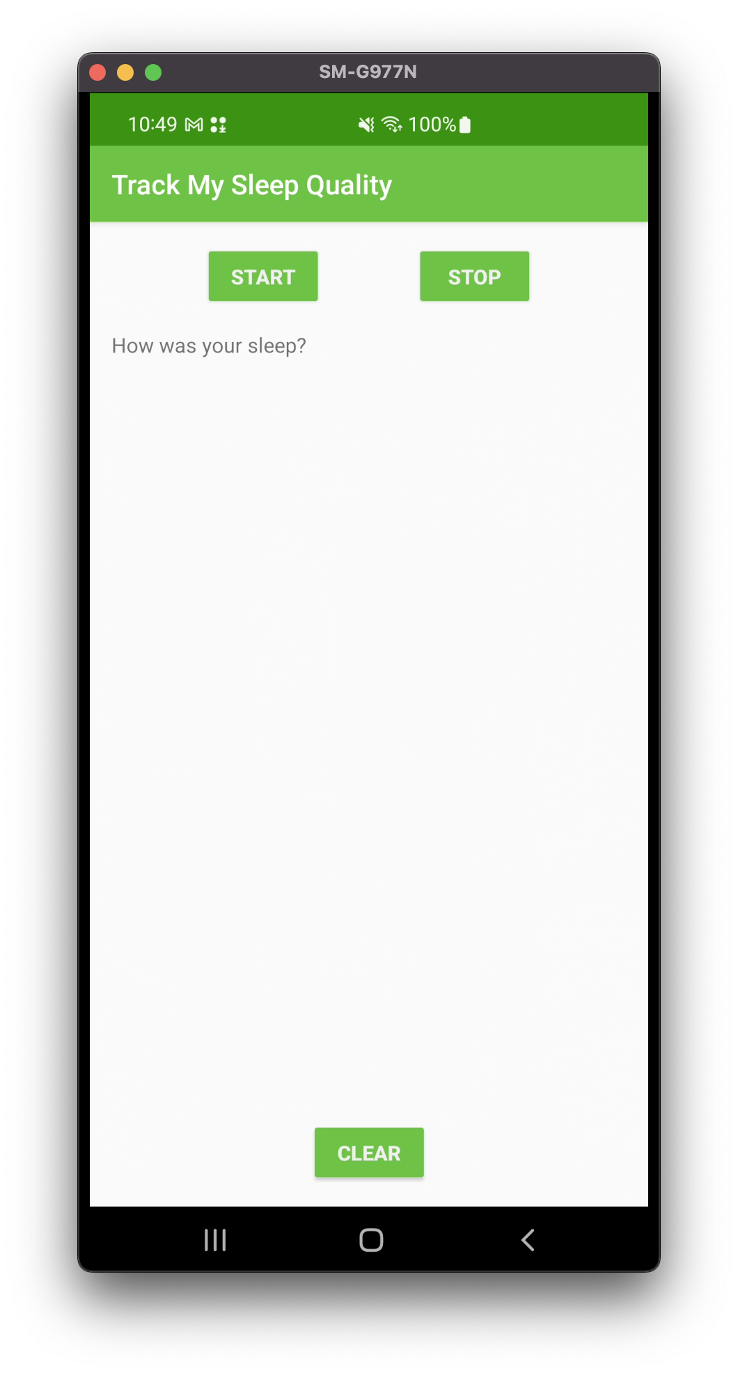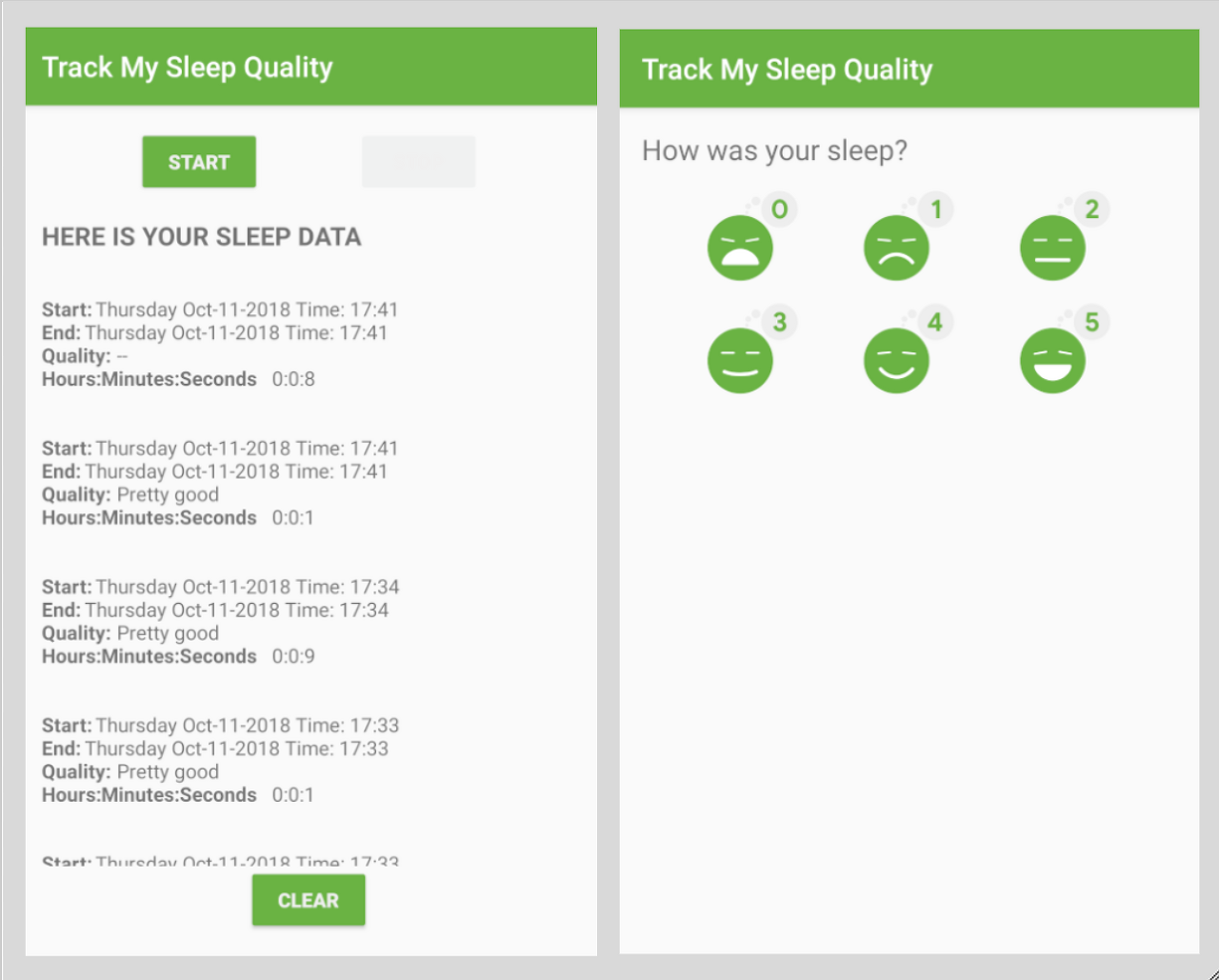 최종 완성본은 위와같이 나의 수면데이터를 저장하도록한다. START버튼을 누른 시점부터 잠이 들었다는 가정이고, END를 누르면 잠에서 깼다는 가정이다. 그렇게 수면이 종료되면 수면시간과 나의 수면 퀄리티를 저장할 수 있도록 한다. 이 전반의 과정이 Room을 활용한 로컬DB에 저장 된다.