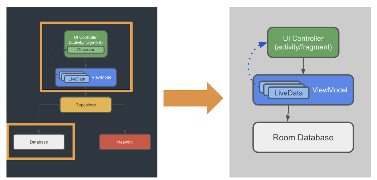 그러나 이번 코드랩에서는 레포지토리와 네트워크 기능을 사용하지 않기 때문에 우측 이미지와 같은 형태를 띄게 될 것이다.
