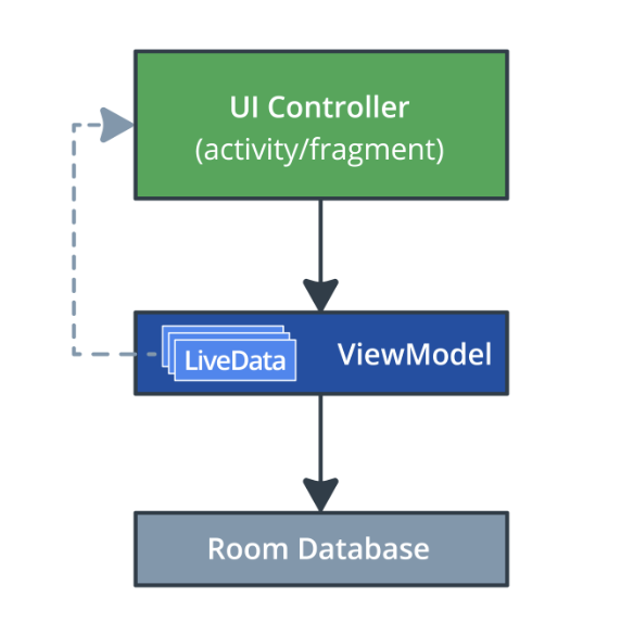 이 코드랩에서는 위와 같은 아키텍처가 사용 됐다. 뷰모델에서 비즈니스 로직과 데이터들을 관리하며, LiveData를 통해서 UI컨트롤러에 변화가 생겼을때 새로 업데이트 시켜주로고 헀다.