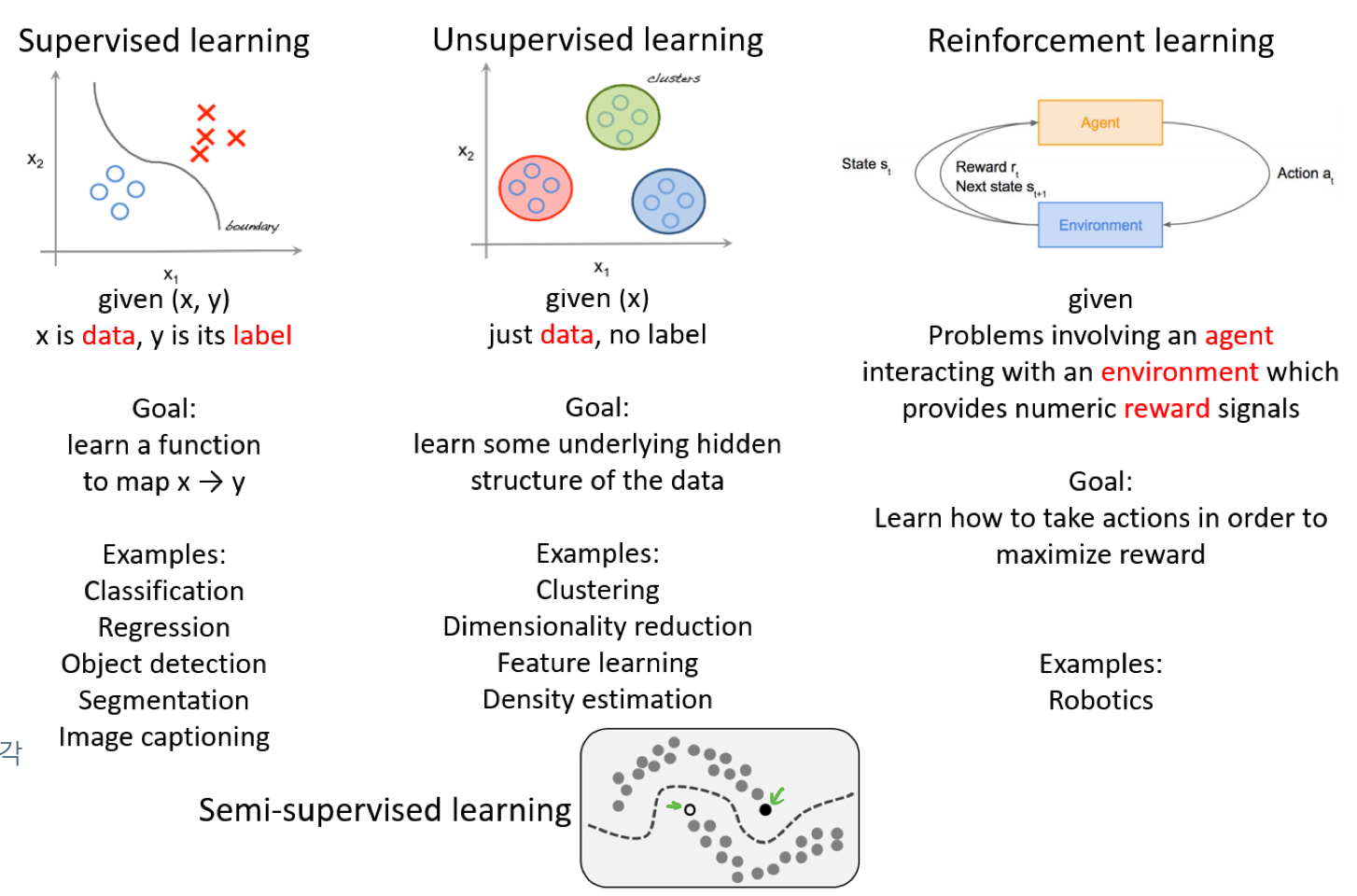 기계학습(Machine Learning)은 교사학습(Supervised Learning), 비교사 학습(Unsupervised Learning), 강화학습(Reinforcement Learning), 준교사 학습(Semi-supervised Learning)으로 나뉜다.