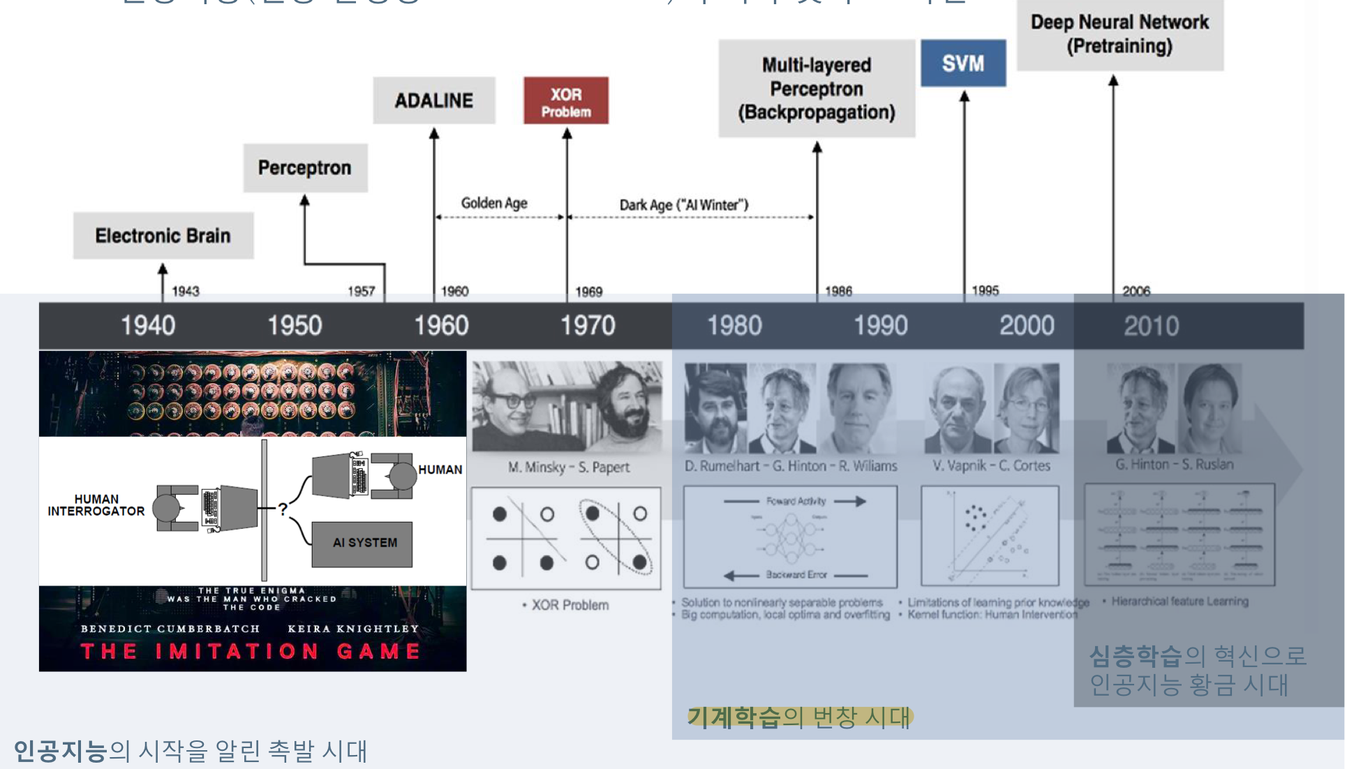 초기 인공지능은  실제 뇌의 뉴런을 이용하여 인공지능을 만들기 위해서, 뉴런을 만들었지만 뇌는 매우많은 뉴런들의 유기적인 연결로 이루어지기 때문에 실패했고 현재의 딥러닝까지 발전했다.