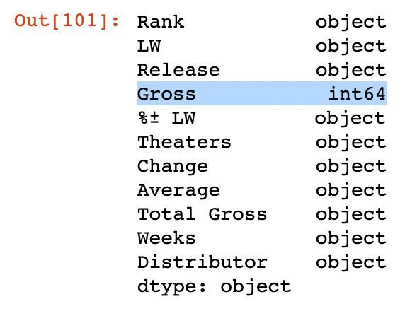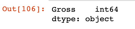 Gross는 object타입이기 때문에 정수(Int64)형태로 변환되어야함과 동시에 그러기 위해서는 $123,456과 같은 달러($)와 쉼표(,)를 없애주어야 한다.
