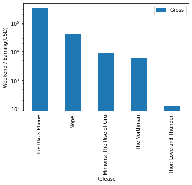 grossDf.plot(kind='bar',logy=True,ylabel="Weekend / Earning(USD)")