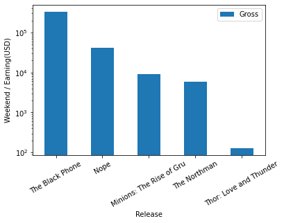 grossDf.plot(kind='bar',logy=True,ylabel="Weekend / Earning(USD)",rot=30) # rot를 바꿔주기는 하지만 여전히 보기 좋지 않음