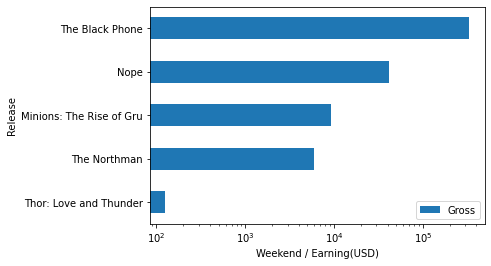 grossDf.sort_values(by="Gross",ascending=True).plot(kind="barh",logx=True) # 내림차순을 오름차순으로 바꾸고 그래프를 그려줌