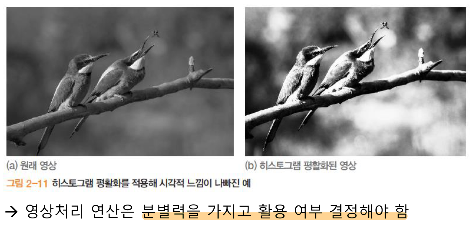히스토그램 그래프에서 특정 값 근방에서 픽셀 분포가 너무 많이 뭉쳐 있는 경우 이를 넓게 펼쳐 주는 방식으로 픽셀 값 분포를 조절 해준다. 즉 조작을 통해 영상 품질 개선을 할 수 있다. 이런 평활화 과정을 거치면 명암의 표현 범위가 늘어나게 되며 영상이 이전 보다 선명해진다.