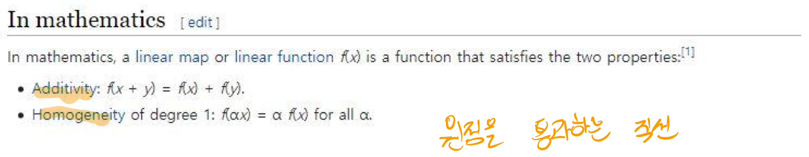위 두가지의 조건을 충족하면 선형함수 이다. 절편이 있으면 원점을 지나지 않지만, 동차좌표계에 넣으면 절편 b가 없어지기 때문에 선형 연산이라고 한다고 한다.