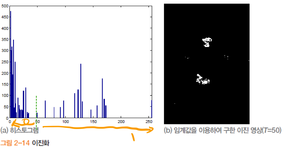 명암 영상을 흑과 백만을 가지는 이진 영상으로 변환하는 과정이다. 이때 임계값T(threshold)를 가지고 이 값은 사용자의 경험이나, 영상으 특성에 따라 자동으로 결정 된다.