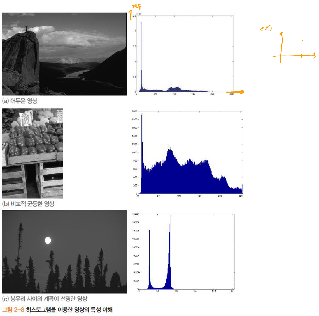 영상자료(사진)는 각각의 픽셀을 가진다. 그 픽셀에는 R,G,B의 3채널 또는 명암과 같은 요소들이 들어간다. 0~255(256개)의 수치로 이러한 값들을 표현하게 되는데 이것을 히스토그램으로 옮길 수 있다. 이러한 히스토그램을 보면서 영상의 특성을 파악할 수 있다.
