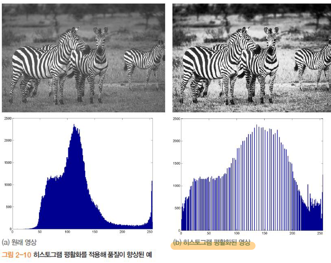 얼룩말의 사진과 뒷 배경이 밝아짐을 알 수 있다. 히스토그램의 평활화를 통해 명암범위가 넓게 변화 된 것 또한 관찰 할 수 있다.