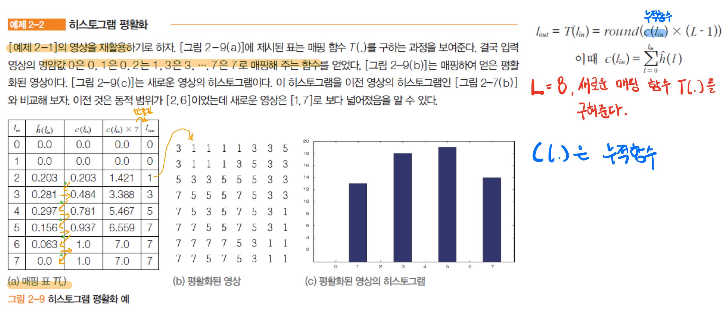 새로운 T(.)함수를 얻기 위해 오른 쪽 수식을 사용한다. 그렇게 얻은 새로운 명암 output값을 토대로 새로운 평활화된 영상의 히스토그램을 얻을 수 있다. C(.)누적 히스토그램이다. 여기 L-1 ( L=8)을 곱해준 값의 반올림을 통해서 새로운 out값을 얻는다.