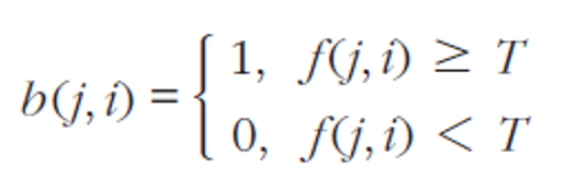 명암 영상을 흑과 백만을 가지는 이진 영상으로 변환하는 과정이다. 이때 임계값T(threshold)를 가지고 이 값은 사용자의 경험이나, 영상으 특성에 따라 자동으로 결정 된다.