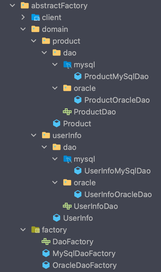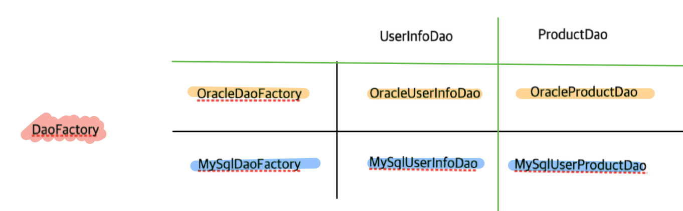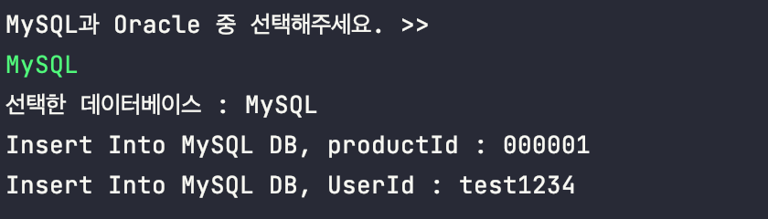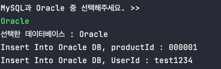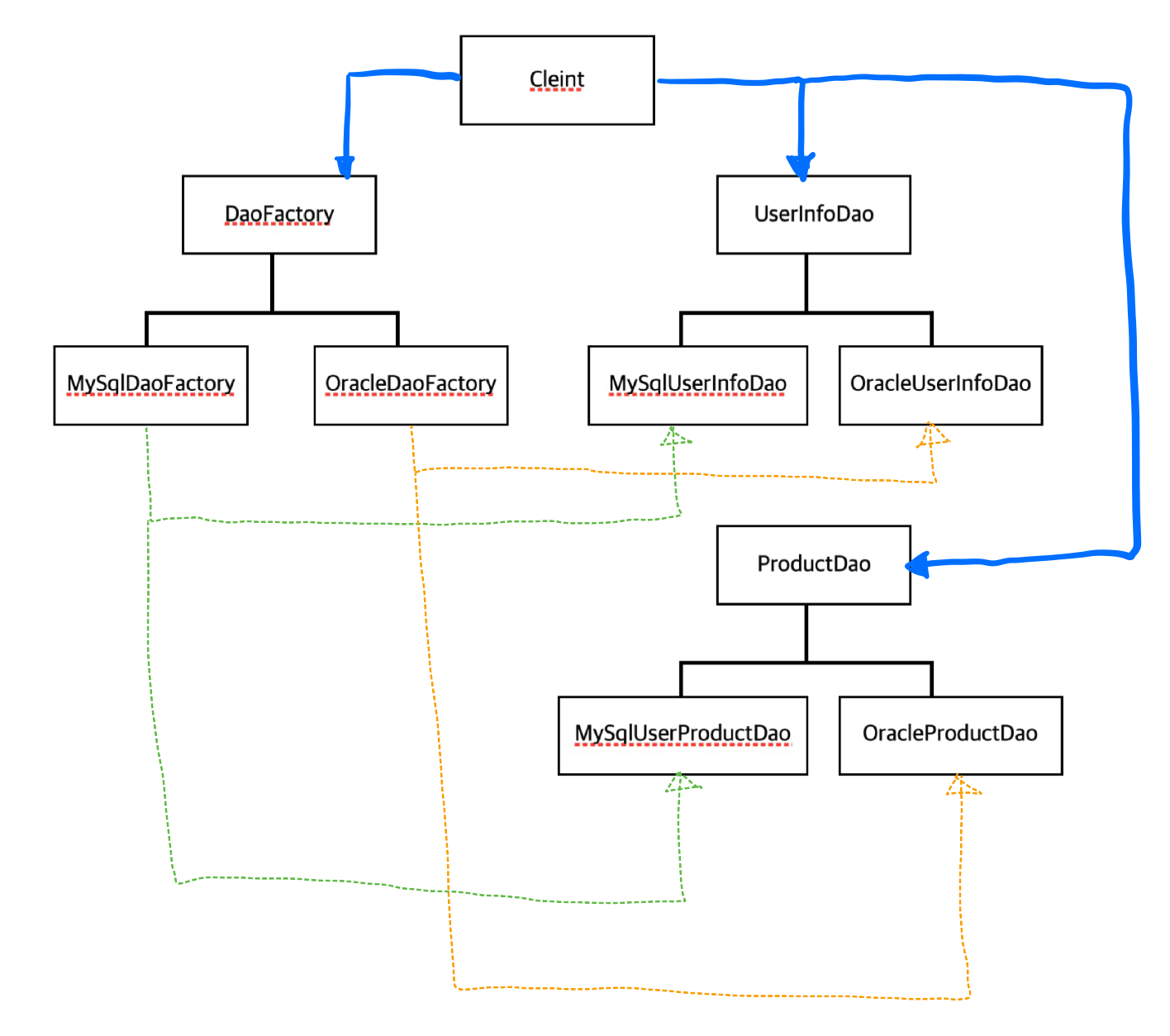 Client(사용자)는 DaoFactory만을 이용해서 각 도메인의 DB(MySQL 또는 Oracle)을 사용할 수 있다.