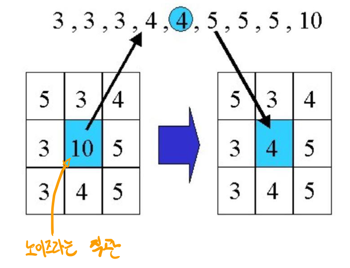 명도는 낮을수록 어둡고, 높을수록 밝다. 아마 "10"이라는 것은 직관적으로 노이즈가 존재하는 곳이라고 알 수 있을 것이다. 그럼 그 주변의 5,3,4,3,10,5,3,4,5를 순서대로 나열하고 중간값으로 해당 노이즈부분을 대체한다. 이것을 통해 이미지가 필터링 되어 잡음이 사라지는 것이다.
