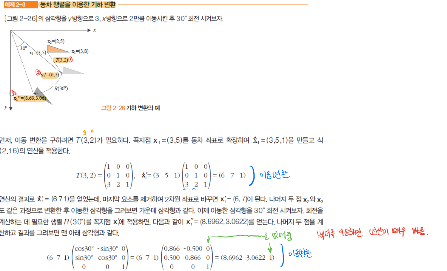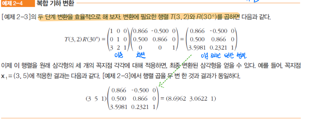 그렇기 때문에 위 2-3의 예제를 조금더 쉽게 할 수 있다. 이동과 회전시키는 행렬을 미리 계산한 후, 그 행렬을 각 꼭지점에 곱해주면 된다.